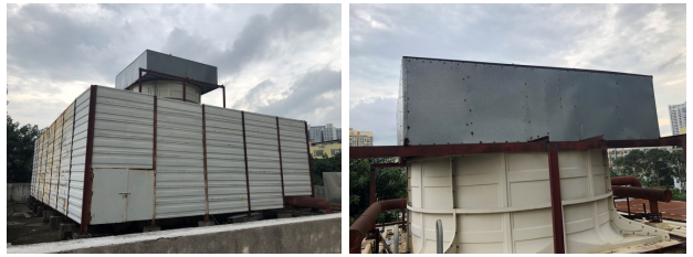 改造前為高轉速動力系統,噪音大 出風口被擋住,散熱效率差 冷卻塔接水盤破裂